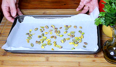 3. Meanwhile, in a small pan put the pistachios and toast for 3-4 minutes. Transfer on a board and roughly chop.