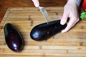 Using a fork, prick the aubergines a few times and put them on a baking tray. Grill for 10-15 minutes on each side, making sure the skin has blackened. Transfer to a board to cool.