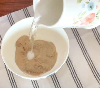 1. Într-un castron mic, amestecati drojdia uscată cu ½ cană de apă călduță (se ia din apa deja cântărită) și lăsați să stea la crescut 5-8 minute, până când apar bule de aer.