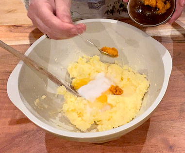 ✔ Într-un bol mare, mixează untul, sarea și zahărul pudră până devin spumoase.