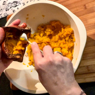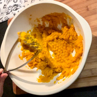 4. Scoateți dovleacul din cuptor și lăsați-l să se răcească. Îndepărtați pielea cu un cuțit. Puneti pulpa intrun bol si cu ajutorul unui pasoar pentru legume faceti un piure. Puteti folosi de asemena si un blender vertical sau un robot de bucatrie.