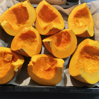 3. Așezați feliile de dovleac pe tava de copt si dati-l la cuptor pentru 40-45 de minute sau până când acesta devine moale atunci cand este intepat cu o furculita. Timpul de coacere depinde de fiecare cuptor.